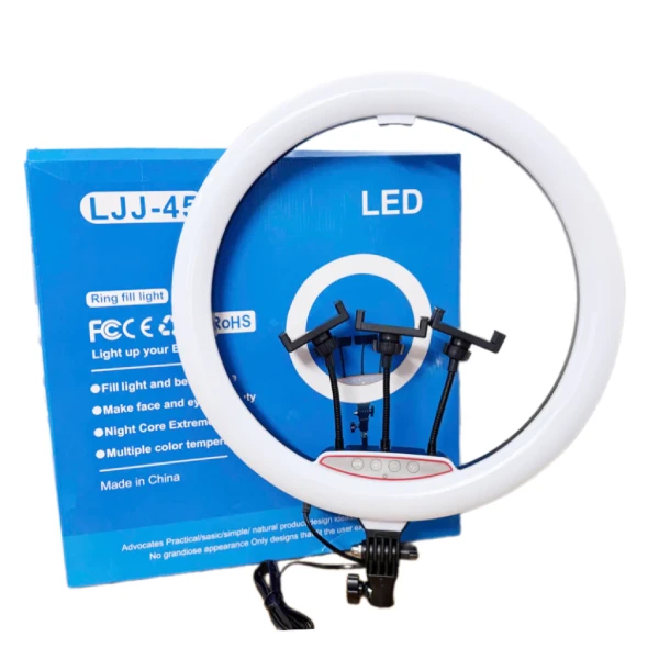 Multi-size livestream ring light (26-45cm) with 3 lighting modes, a 360° phone holder, and a sturdy 2.1m stand for bright, professional-looking videos